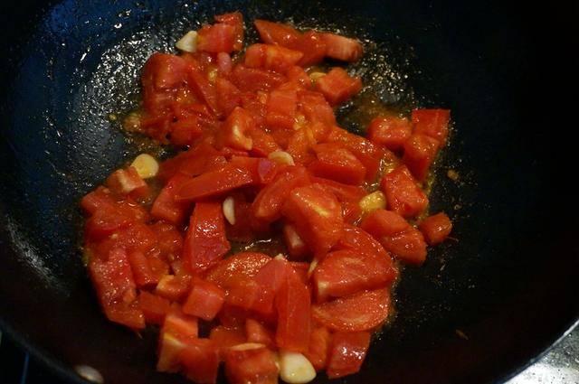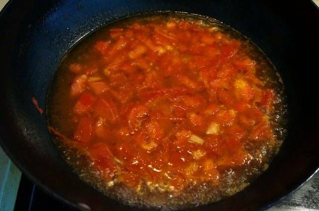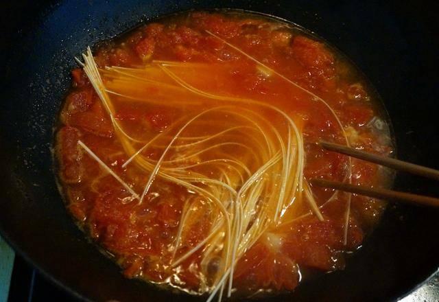 6. 倒入適量的雞湯煮開,這時的番茄皮已經和番茄脫離了,所以可以用筷子從鍋中夾出
