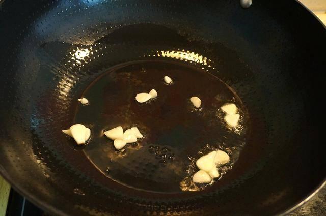 4. 熱鍋涼油,將切好的蒜片入鍋中煸炒出香味