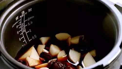 3、把白蘿蔔塊兒和泡好的香菇連同泡香菇的水一同倒進電飯煲內膽,也可以用普通的煮鍋。