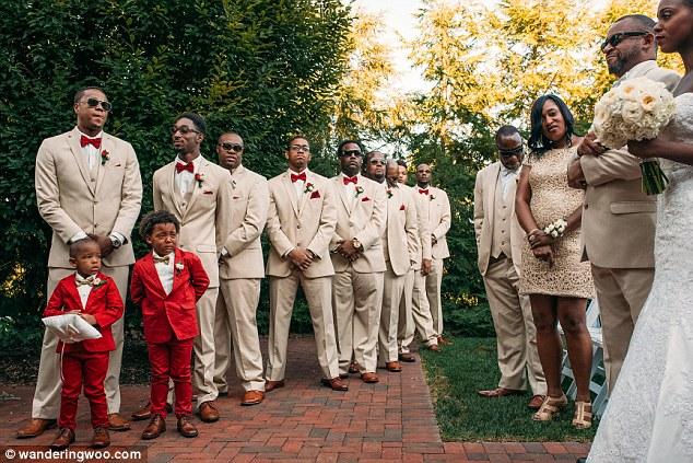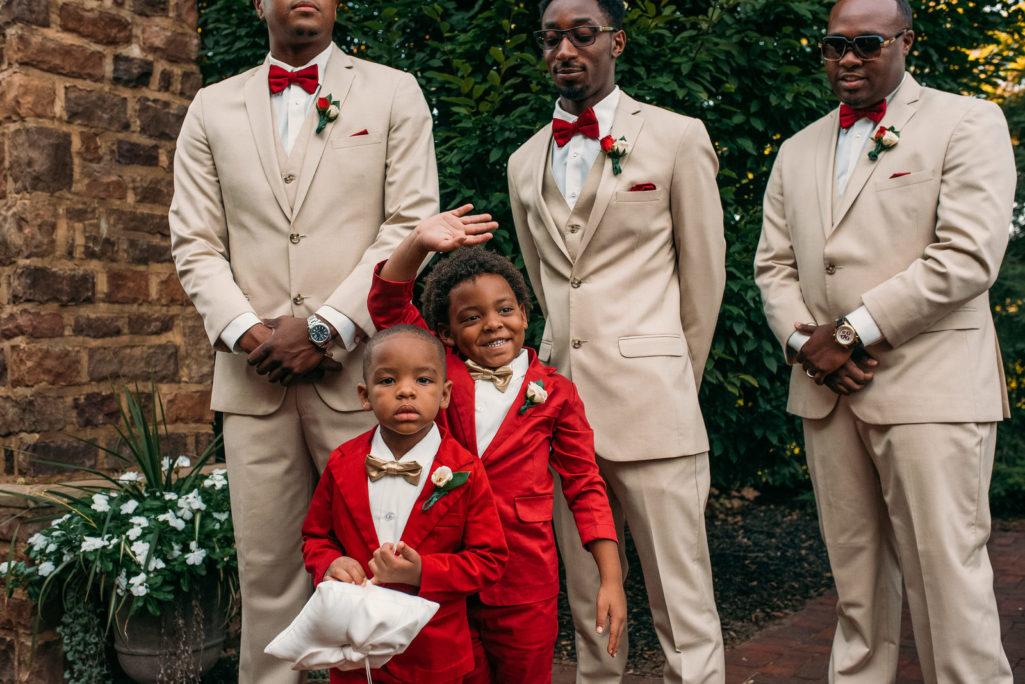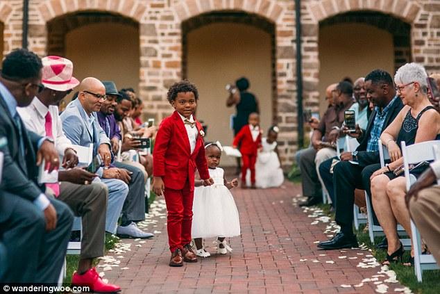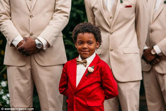 布萊森穿上紅色的西裝,打著可愛的金色領結,還有一頭可愛的小捲毛,看起來超級顯眼,之後他更牽著小花童進場,臉上全是笑容,看得出來他有多麼的高興。