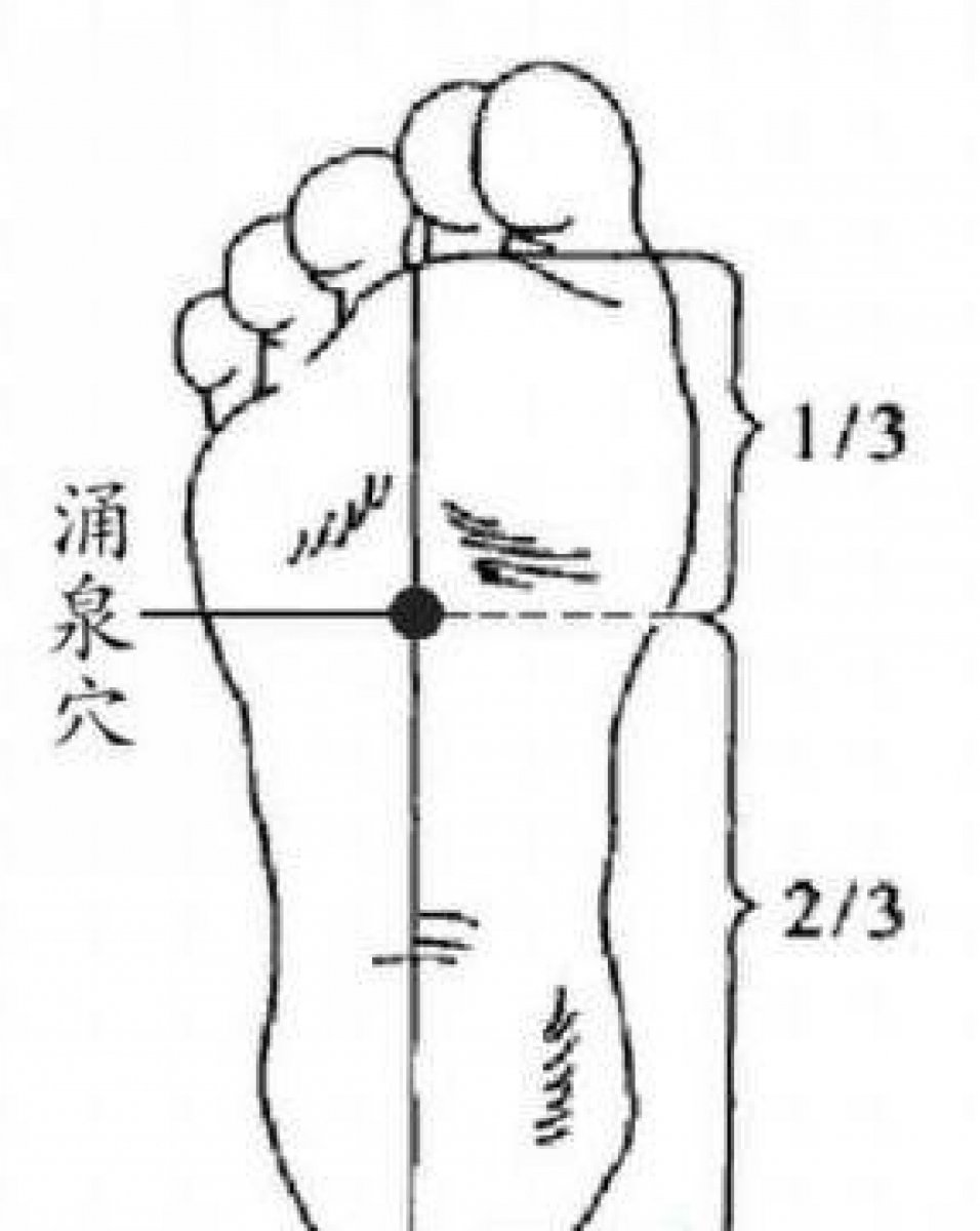 湧泉穴位置在足底的前1/3處(計算時不包括足趾),這個穴位比較敏感,不要用太大的力度,稍有感覺即可,以邊按邊揉為佳,持續5分鐘左右即可。