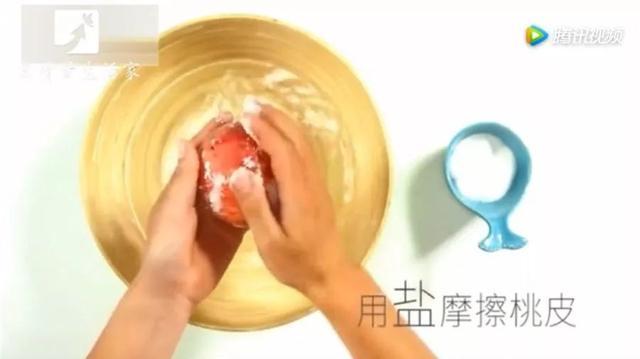 二、準備適量的溫水,撒入少許食鹽,然後將桃子放在水中,用手輕輕一搓,桃毛就能夠很快脫落,之後再用清水沖洗表麵即可。