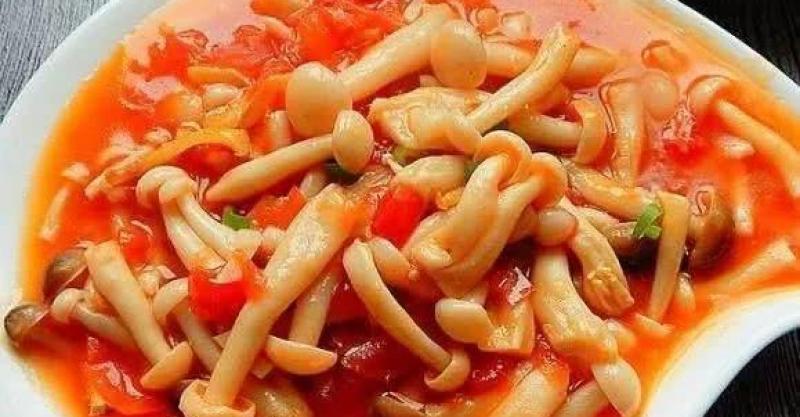 4.火鍋油,將白蘑菇放入鍋中煸炒,倒入少許醬油,然後倒入小番茄炒勻。