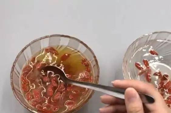 放進去清洗一下,大家可以看到碗裡的水是不是非常渾濁呢,將清洗過的枸杞撈出對比一下,表麵是不是被清洗的非常乾淨呢,