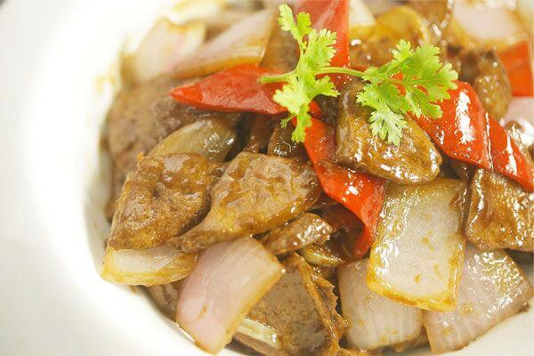 倒入洋蔥翻炒,再放入少許水,加入老抽、倒入豬肝加入半勺 鹽、1勺糖、半勺雞精、少許醋調味。