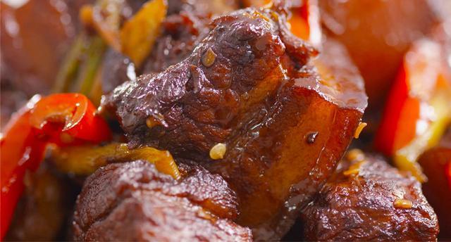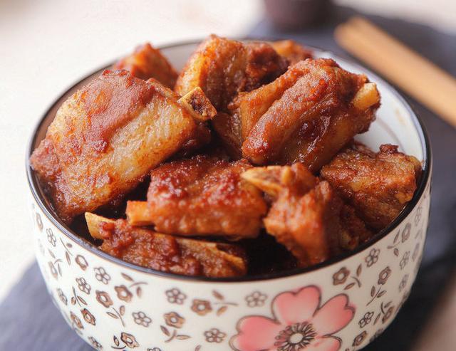 倒入生抽,紅燒醬油和料酒,翻炒肋排至上色均勻。