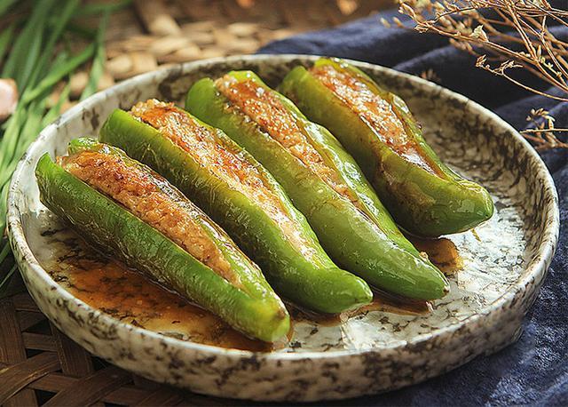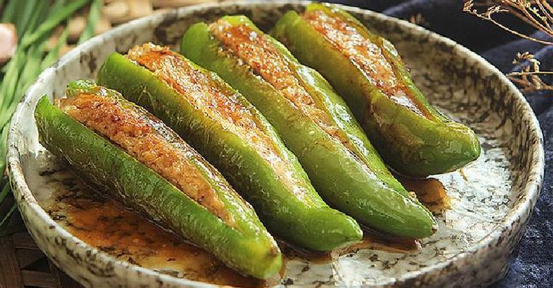鍋內放油,放入鑲好的青椒入鍋煎,煎片刻後再翻動一麵,使青椒煎成虎皮狀;