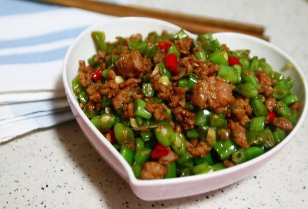 豆角成熟之後 加入之前炒好的肉沫 加適量的鹽 翻炒均勻