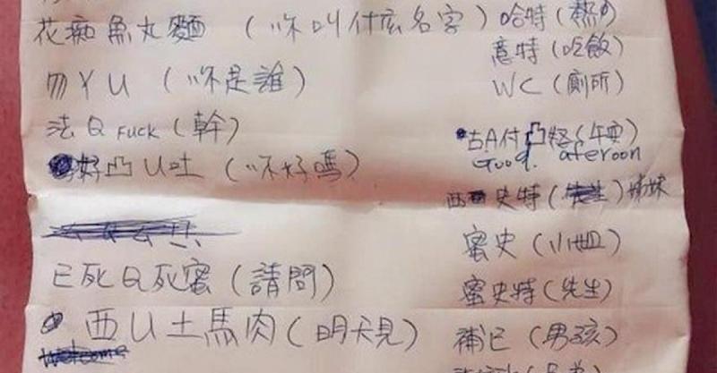 女網友表示,自己在整理家裡時,恰巧翻到媽媽以前的跟同事學習的英文筆記。只見上麵寫了「發落蜜」(跟我來)、豪啊U(你好嗎?)等日常用語,但也有些怪怪的唸法,例如「花癡魚丸麵」是「你叫什麼名字」,「彎耐好罵去」是「一晚多少錢」,「舅摸奶」是早安,而花的唸法竟然是「扶老二」!