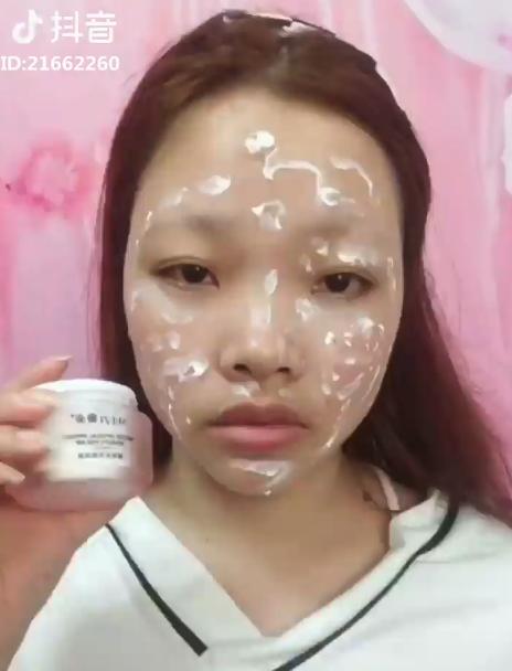 接著開始塗抹化妝品在臉上,看起來是有潤色跟遮瑕的效果,看這個用量...不少啊!