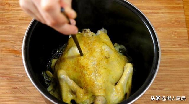 8.待電飯鍋跳閘以後,取出,用筷子紮一下雞腿部分,如果沒有血水往外流,就證明熟了。