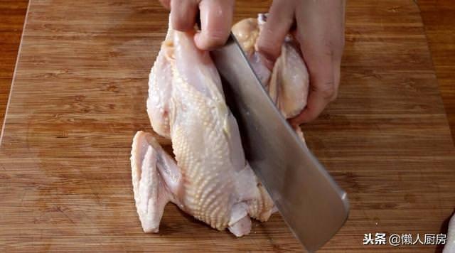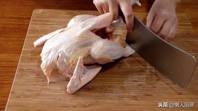用刀剁掉雞腳,剁開雞肚子,這樣便於雞肉清洗和入味。
