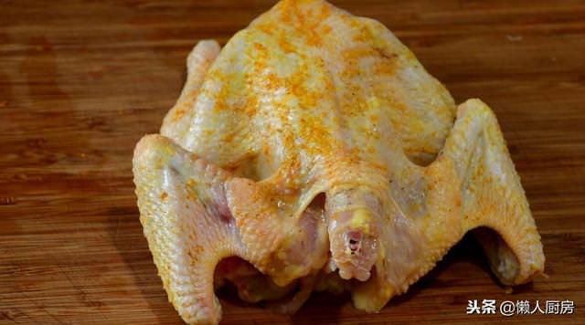 最後在雞皮上抹上一點薑黃粉,抹勻。