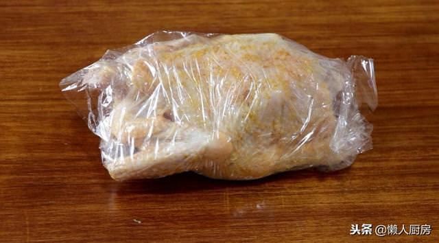 將擦好醃料的雞用保鮮膜包裹上,放置一邊醃製半小時。