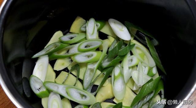 6.在電飯鍋內膽底部和內壁刷上一層油,鋪上切好的蔥片和薑片。