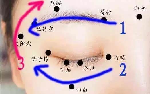 1.沿著眉毛上方,從眉間向鬢角方向敲擊;