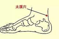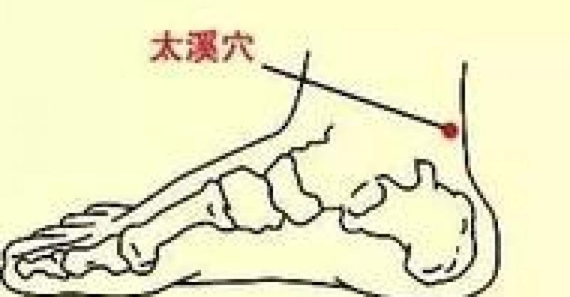 太溪穴:太溪穴位於足內側,內踝後方與腳跟骨筋腱之間的凹陷處。