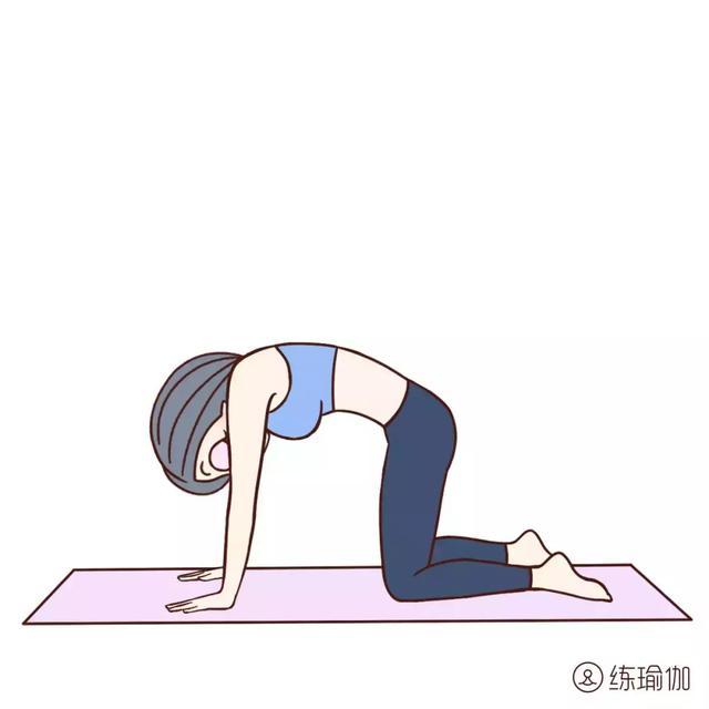 step 2.貓式:呼氣,含胸拱背,下巴尋找鎖骨,眼睛看向肚臍,背部盡量向上,呈弧形。