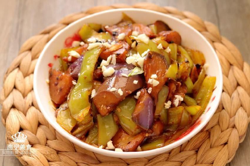 4、接著把茄子也倒進去一起大火翻炒,然後把青椒也倒進去一起翻炒