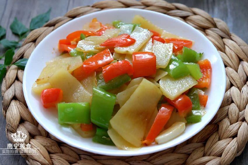 1、 把馬鈴薯去皮後切成片,紅甜椒洗乾淨後切成塊,青椒洗乾淨後切成塊待用
