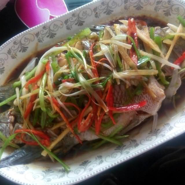 6.蒸好的魚端出,倒掉盤內蒸出的水分,去掉表麵的蔥薑青紅椒絲。