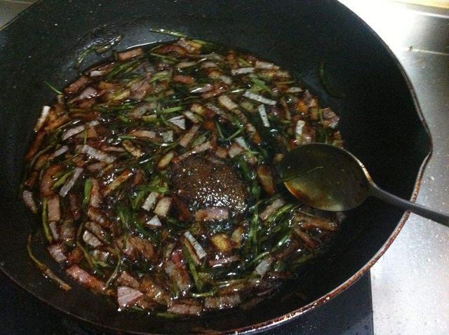 (2)熱鍋倒油,放入切好的綠蔥段;