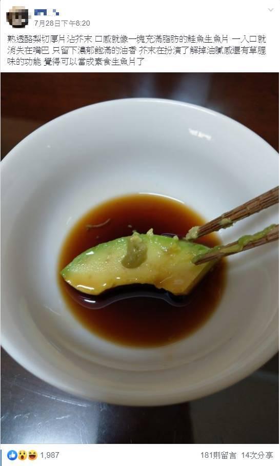 臉書《廚藝公社》充滿網友們做料理的飲食心得,日前就有一名男網友熱情分享「酪梨最新吃法」。把熟透的酪梨切成厚片狀,沾芥末、醬油,「口感就像一塊充滿脂肪的鮭魚生魚片」,入口即化,只留下濃鬱飽滿的油香。
