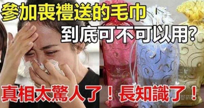 喪家舉辦喪禮時都會送參加者一條毛巾,原來意在方便人們在長時間的喪禮中擦眼淚或汗水,該報導也表示,有許多人認為毛巾會帶有晦氣,但其實是多慮,如果真的在意,將毛巾洗過之後即可正常使用。