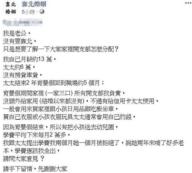 夫妻之間談錢真的傷感情?最近有一名男網友發文詢問「大家家裡開支都怎麼分配」,他表示自己月薪約13 萬,太太約6 萬,無房貸車貸,妻子剛結束2年的育嬰假,重返職場約5個月,不過以下的敘述卻讓多數網友直搖頭,你們覺得呢?
