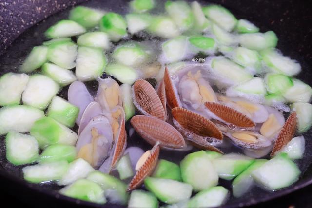 6、接著把蛤蜊也倒入鍋中,然後倒入沒過食材的開水,記住是開水,不是涼水哈,開水可以在翻炒絲瓜之前就可以用電熱水壺燒水準備著了。