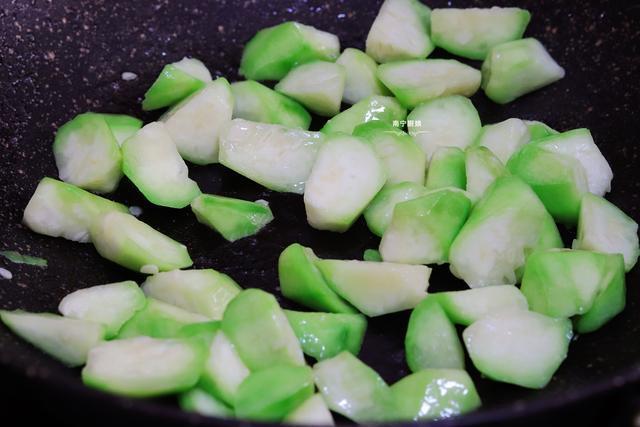 5、重起鍋,在鍋裡倒入適量的食用油,小火燒熱,然後把絲瓜塊倒入大火翻炒1分鐘,大戶翻炒過後絲瓜打湯不會發黑哦!