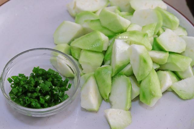 2、把絲瓜蝦皮後切滾刀塊,香蔥洗淨後切碎,生薑切塊待用。