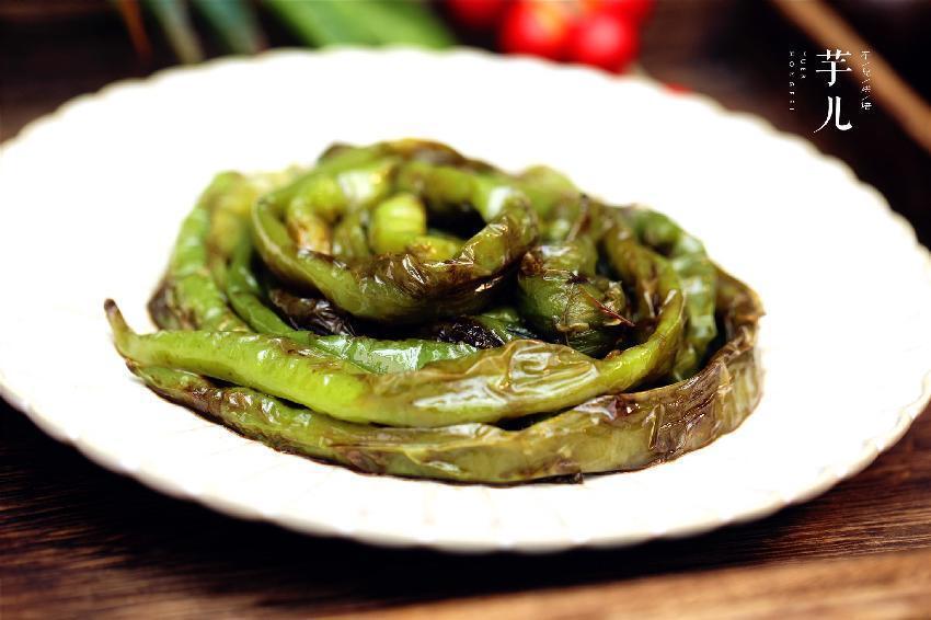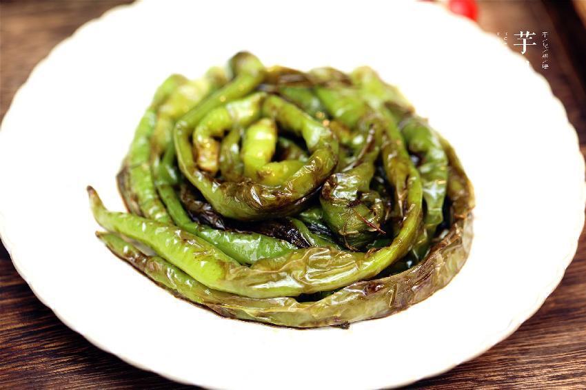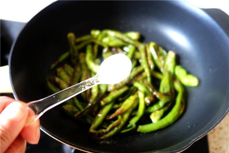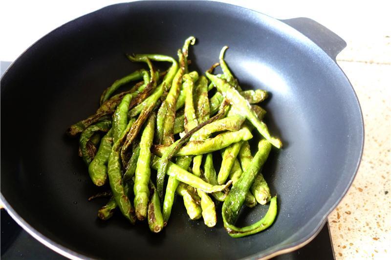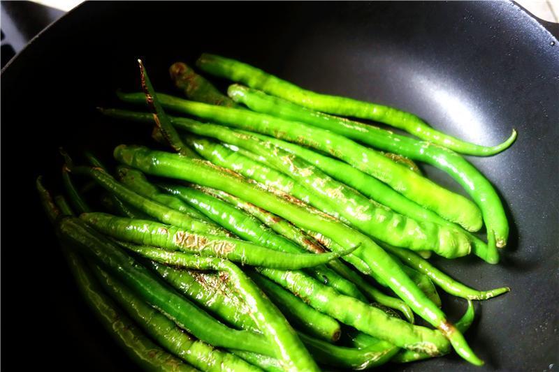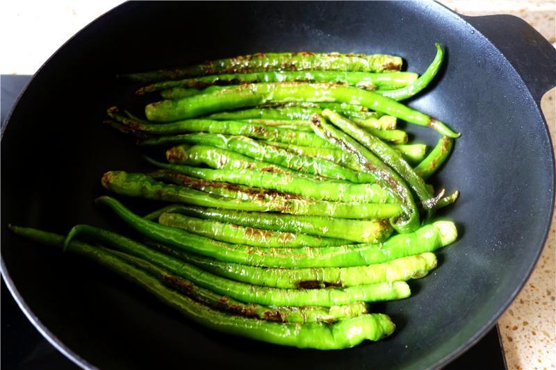 6.直到兩麵都成虎皮的時候,將青椒剷出。