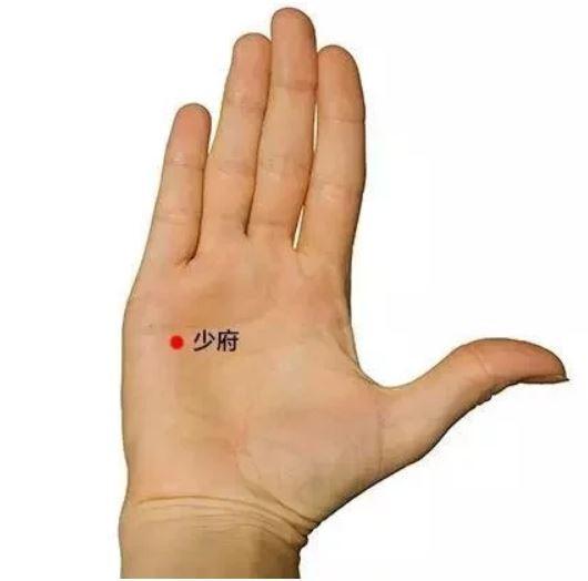 少府穴是手少陰心經的穴位之一,位於手掌麵,第4、5掌骨之間,握拳時,當小指尖處。取穴時仰掌,手指屈向掌心橫紋,當小指指尖下凹陷處是穴。