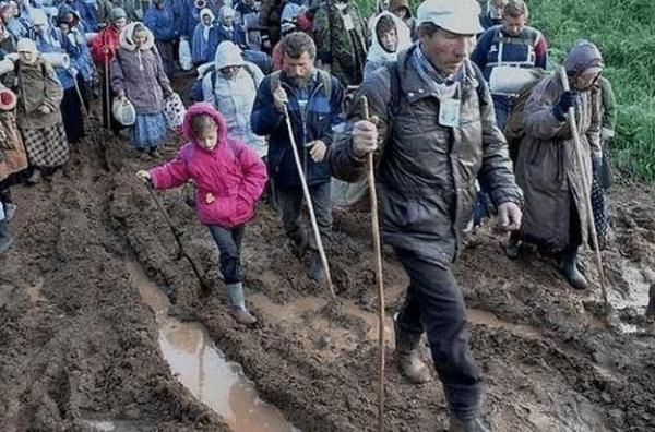 俄羅斯農村人走在泥濘的道路上。有的人還拄著棍子。