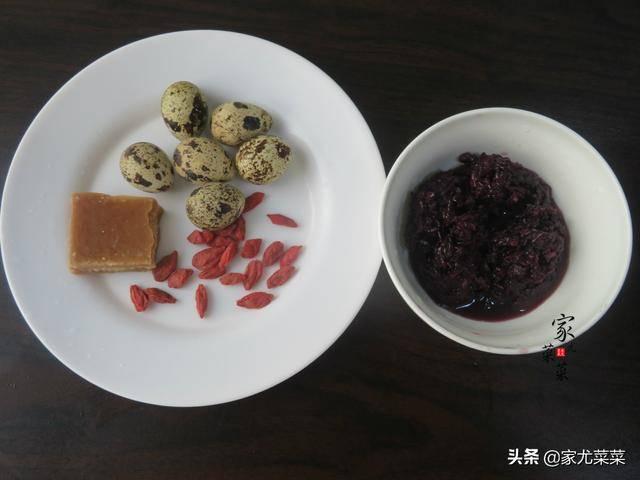 【準備食材】:黑米酒糟,鵪鶉蛋,枸杞,紅糖