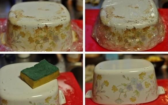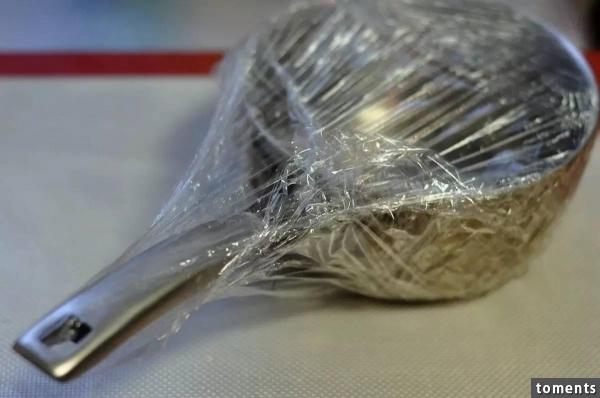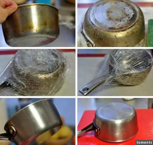3.用保鮮膜把鍋包起來,如果鍋內部也有汙垢的話,剪一塊保鮮膜貼住,原則是使鍋和小蘇打充分接觸,隔離空氣。