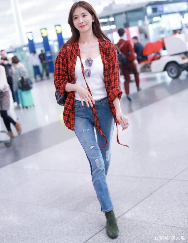 一件簡單的低領T恤下搭一條淺色的牛仔褲,在加上一件經典的紅色格子襯衫看上去簡約時尚又十分的顯氣質,搭上一雙裘皮高跟鞋和一頭飄逸的長髪,不愧是仙女呀!