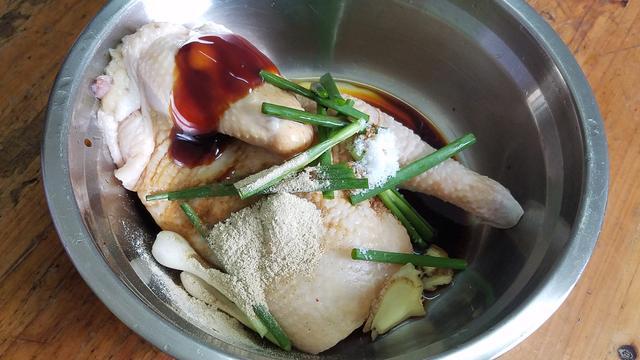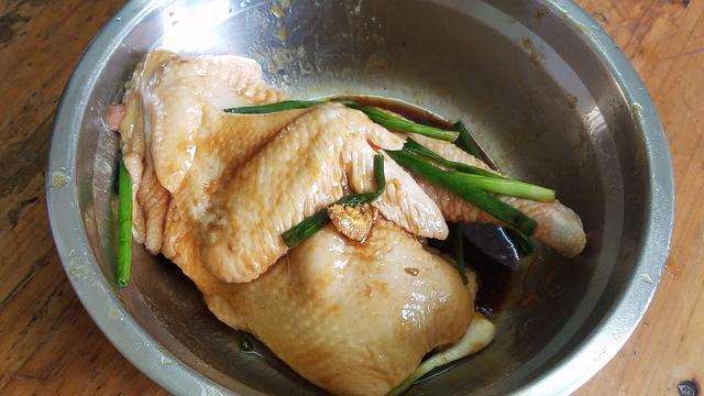 1.買回來半隻雞,清洗乾淨後瀝幹水分,然後放入蔥段跟生薑,最後在放一勺的胡椒粉、2勺生抽、半勺鹽、一勺蠔油、適量的花生油,用手把雞身塗抹均勻後,讓它醃製30分鐘以上,醃製的時間越長越入味。