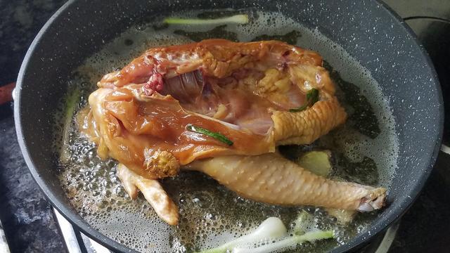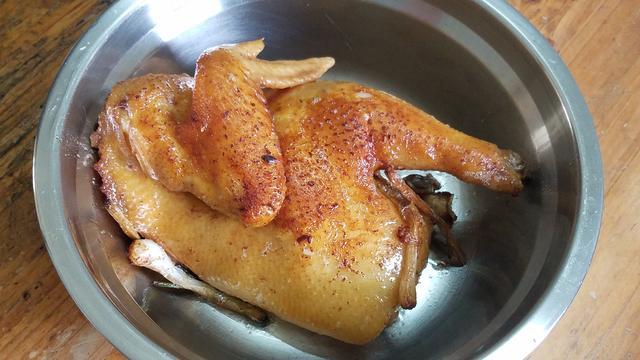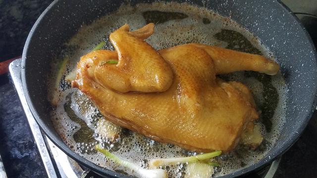 3.煎雞的時候要勤翻麵,可以用大勺子把熱油澆在雞皮上,這樣可以讓雞皮更好的上色,大概煎個5-6分鐘,雞皮已經上色就可以出鍋了,不用管雞肉是生還是熟,這一步主要是讓雞肉上色。