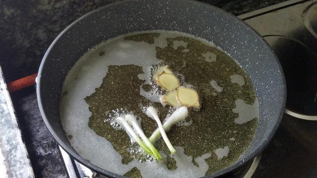 2.鍋裏放多一點油,放入蔥白跟生薑炒出香味,然後把醃製好的雞肉放進去,小火慢煎,記住不要用大火哦,大火就容易糊了。