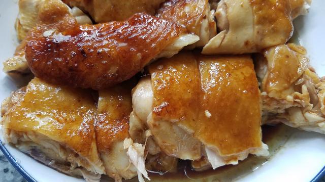 5.時間到了之後,把蒸熟的雞肉拿出來稍微放涼後斬件裝盤,最後澆上蒸出來的湯汁。
