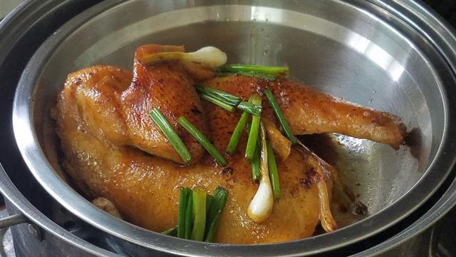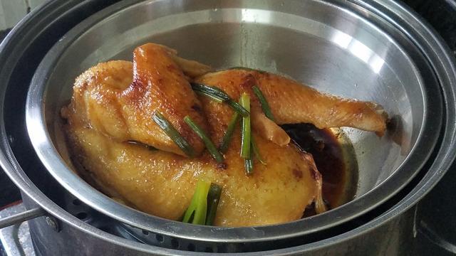 4.雞肉出鍋後,把之前醃製雞肉的醬汁澆在雞身上,然後放進燒開的蒸鍋裡麵,中大火蒸15分鐘左右,如果是整隻雞的話,蒸的時間可能要久一點。