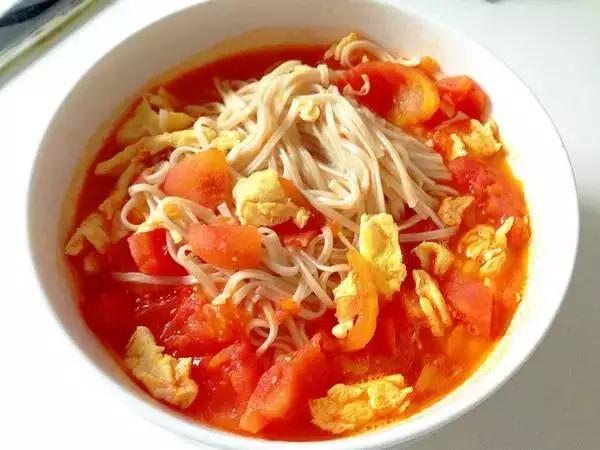 2、西紅柿湯麵:西紅柿炒熬成湯後,加適量水,下麵條,加鹽,連湯帶麵食用。