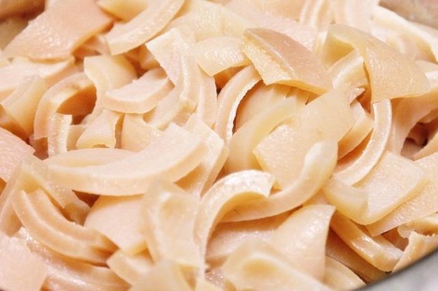 2、將煮好的豬皮切條備用。