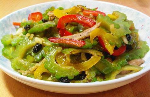 食材:250g苦瓜、50g彩椒、50g瘦肉、適量油、適量鹽、適量糖、適量蒜、適量幹豆豉