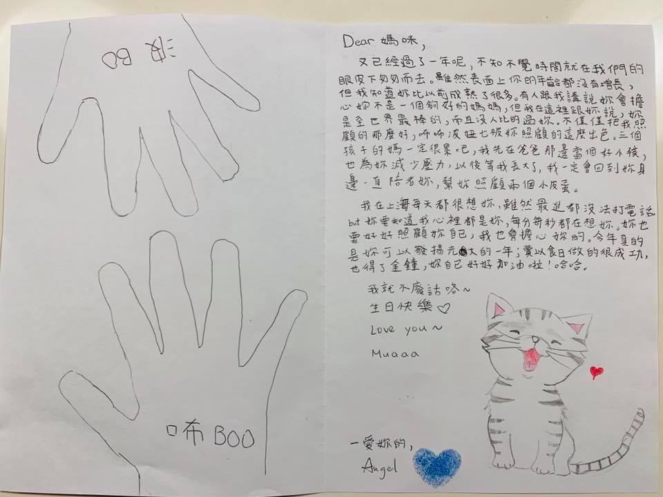 梧桐妹說,自己雖然身處上海,無法天天打電話,卻每天都思念著賈靜雯,也常常會擔心媽媽的狀況,因此希望賈靜雯能好好照顧自己,還俏皮地喊話:「妳自己加油啦!哈哈」最後畫上一隻可愛貓咪還有兩個妹妹的手掌,滿滿都是對家人的牽掛與愛。