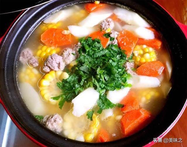 食材:山藥、胡蘿蔔、玉米、豬骨、肉碎、鹽、香菜。