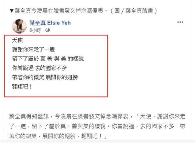 葉全真在文中稱「天使,謝謝你來走了一遭。留下了屬於真善與美的樣貌,你曾說過,去的國家不多,帶著你的微笑,展開你的翅膀,翱翔吧」、「我沒有翅膀,眼淚就送到這裡。天使,飛吧!去你想去的地方,去見你想見的人……」