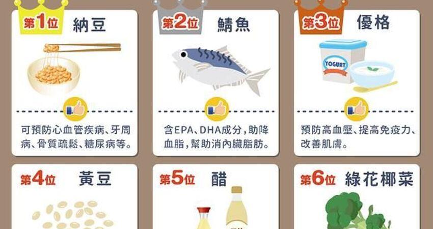 第一名:納豆納豆是由黃豆發酵製成的豆製品,不僅保有黃豆的營養價值,還富含維生素K2等多種對身體有益的物質,可以預防許多疾病如心血管疾病、牙周病、骨質疏鬆、第2型糖尿病、失智症等等。